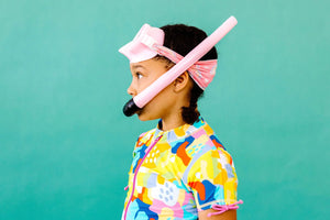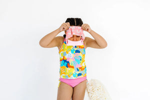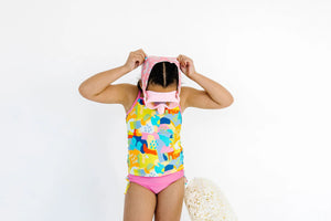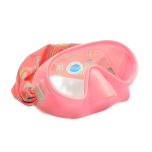 Loksins sundgleraugu sem eru þægileg og meiða ekki! Það kannast allir foreldrar við grátur og pirring þegar venjuleg sundgleraugu festast í hárum á börnum þegar þau eru sett upp. Svo renna þau til og detta oft af. Gleraugun eru með stórri grímu og loka fyrir nefið - frábær til að kafa með.