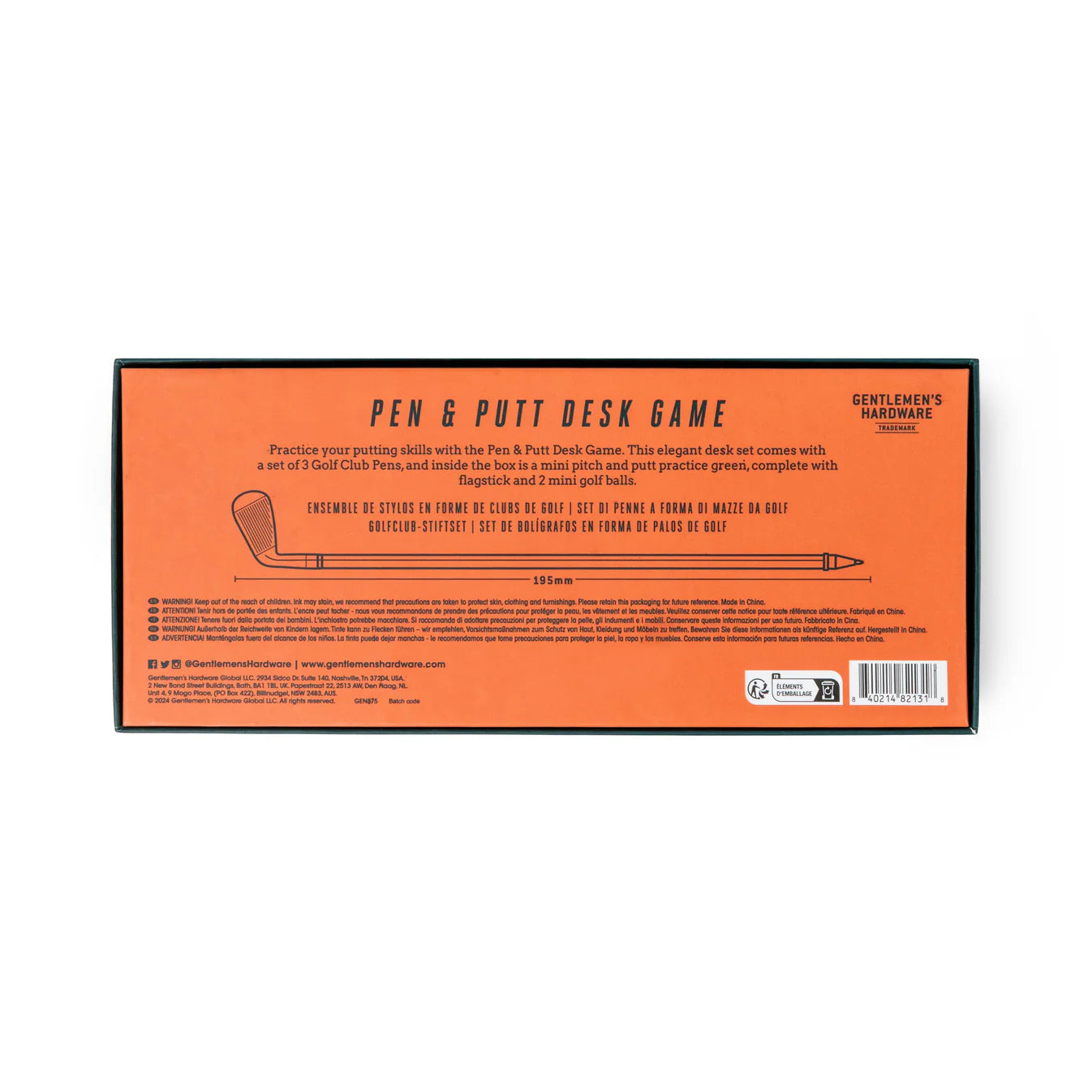 Æfðu þig í púttinu með Pen & Putt skrifborðsleiknum! Þetta stílhreina sett inniheldur 3 golfpennana með bláu, svörtu og rauðu bleki. Inni í kassanum er mini æfingagrænn púttuvöllur, fullbúinn með flaggstöng og 2 litlum golfkúlum.