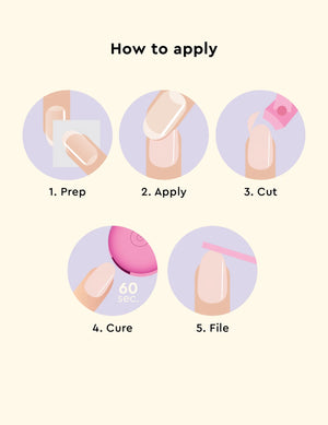 Wash your hands thoroughly. Push back cuticles. Use a nail file to gently buff the surface of your nails. Use prep pads to wipe off oil, dust & residue. Let dry. Moisture on your nails can weaken the adhesion of the nail strips.