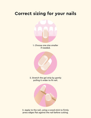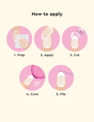 Wash your hands thoroughly. Push back cuticles. Use a nail file to gently buff the surface of your nails. Use prep pads to wipe off oil, dust & residue. Let dry. Moisture on your nails can weaken the adhesion of the nail strips.