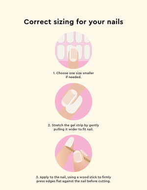 Select the strip that best fits the size of your nail & remove it from the sheet. If you are in between sizes, always size down, and then you can stretch the sticker wider to fit the nail. Apply the strip to the center of the nail, close to the cuticle, without actually on the cuticle. Press the strip firmly down on all sides of the nail, especially the nail edge. Use the wood stick to press the edges of the strip down to ensure there are no air bubbles.