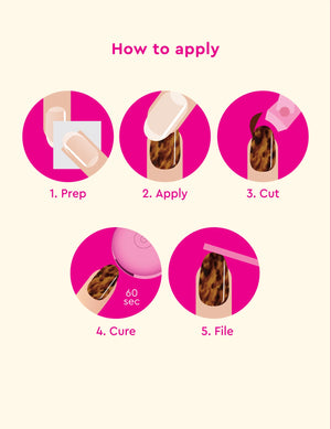 Cure under LED light for 60 seconds. Check to see if your strips have cured completely. They should be hard and sealed to the nail. This will boost the gloss and durability of the manicure. If needed, you may cure it for an additional 60 seconds. PRO TIP: Avoid exposing unused strips to LED light during the curing process, as this will cause them to harden.