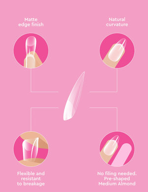 Choose your favorite nail shape and finish: Matte Almond, Short Coffin, and Short Round Square come in a matte, pre-bufflook, while the Medium Almond, Medium Coffin, and Medium Square come in a clear finish.