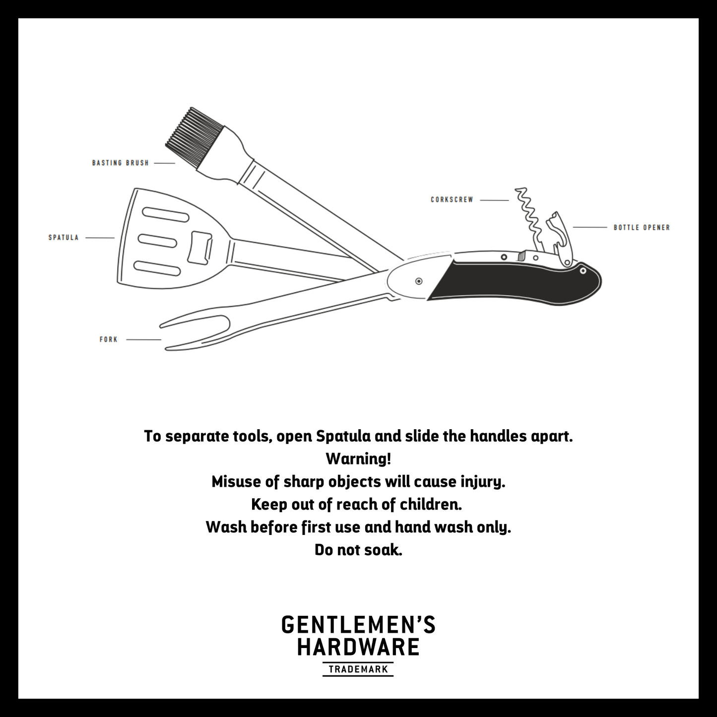 Sniðugt og hagnýtt grill-verkfæri. Til að hámarka grill árangur gerir BBQ Multi-Tool frá Gentlemen’s Hardware þér kleift að snúa, stinga og opna flöskur á fljótlegan hátt. Verkfærið er smíðað með traustu viðar handfangi og ryðfríu stáli og er hannað til að vera endingargóð viðbót við hvaða úti grillbúnað sem er.