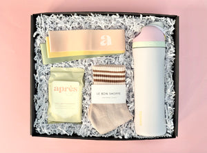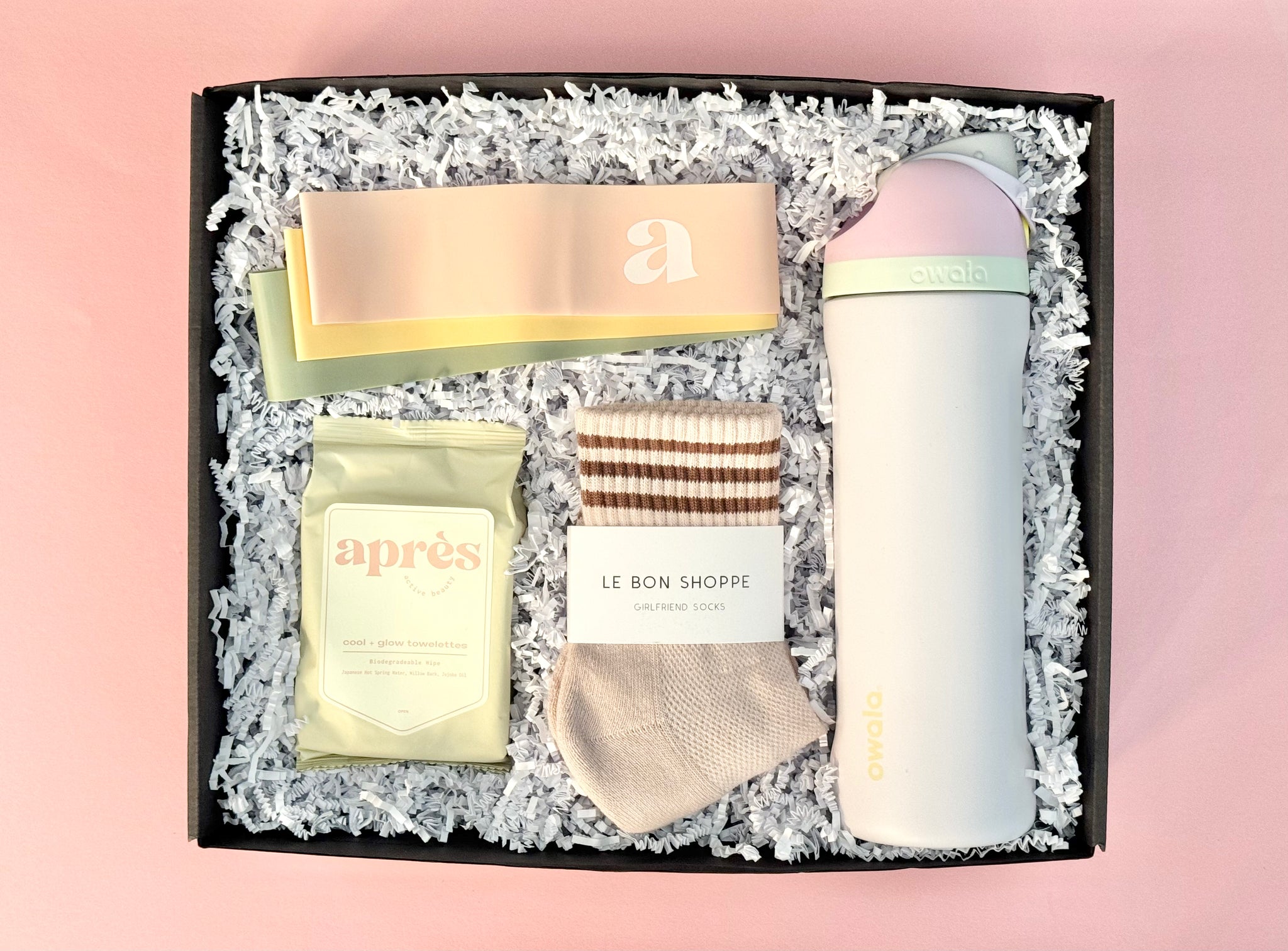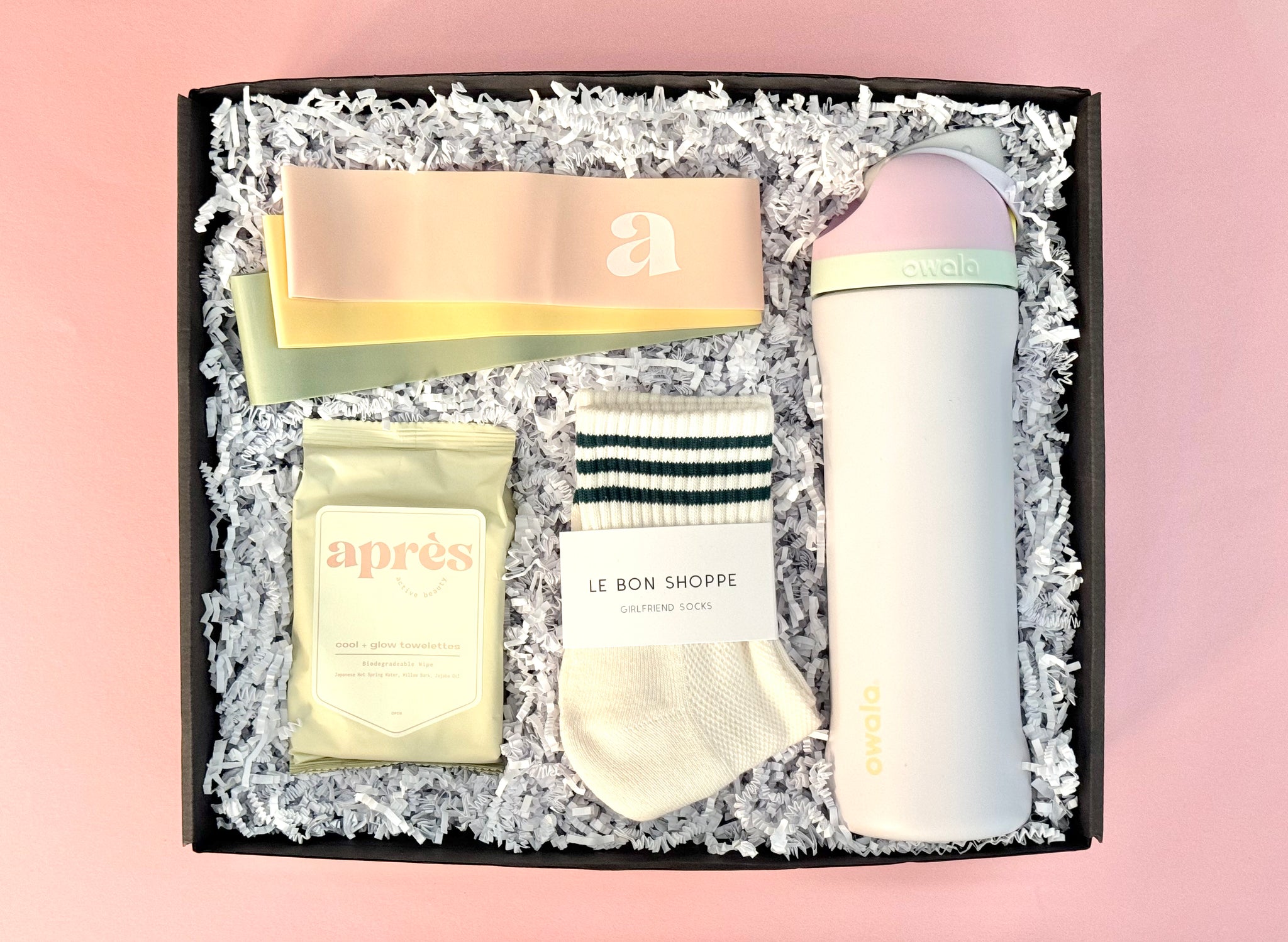 ...alla sem fara elska að huga að líkama og sál. Gjafaboxið inniheldur Owala brúsa sem er fullkominn ræktarfélagi, þægilega og vandaða Girlfriend sokka, Æfingarteygjur 3 stk. og Cool & Glow andlitsblautþurrkur.