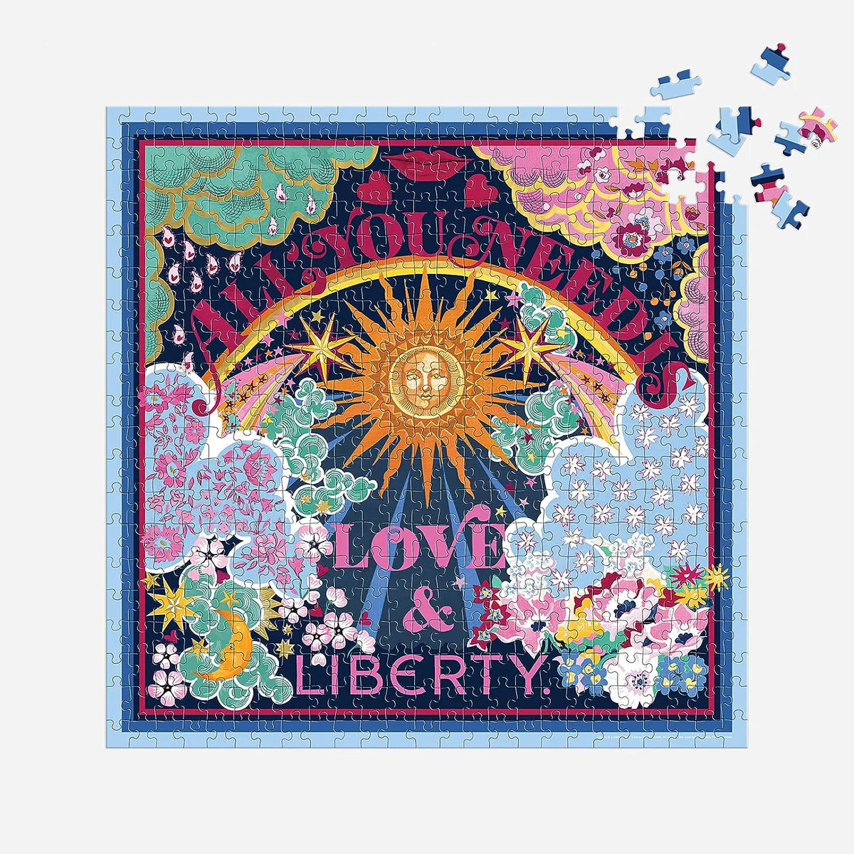 „Liberty All You Need is Love“ 500 bita bókapúsl sýnir litskrúðuga hönnun þeirra innblásna af von, ást og samfélagi. Púslið er skreytt sígildu Thorpe-mynstri Liberty.