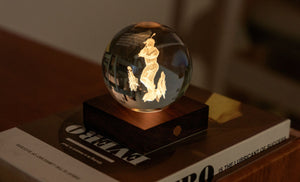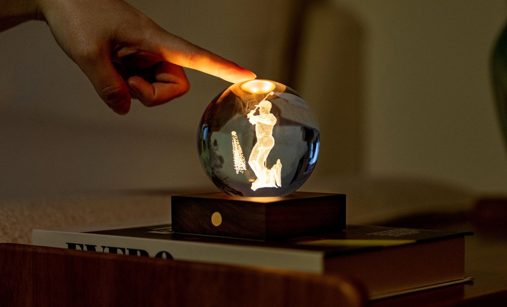 The Amber crystal ball will reflect light in a way that creates an enchanting atmosphere. You can switch between three light intensity levels by touching the copper button on the front of solid natural walnut wood base.