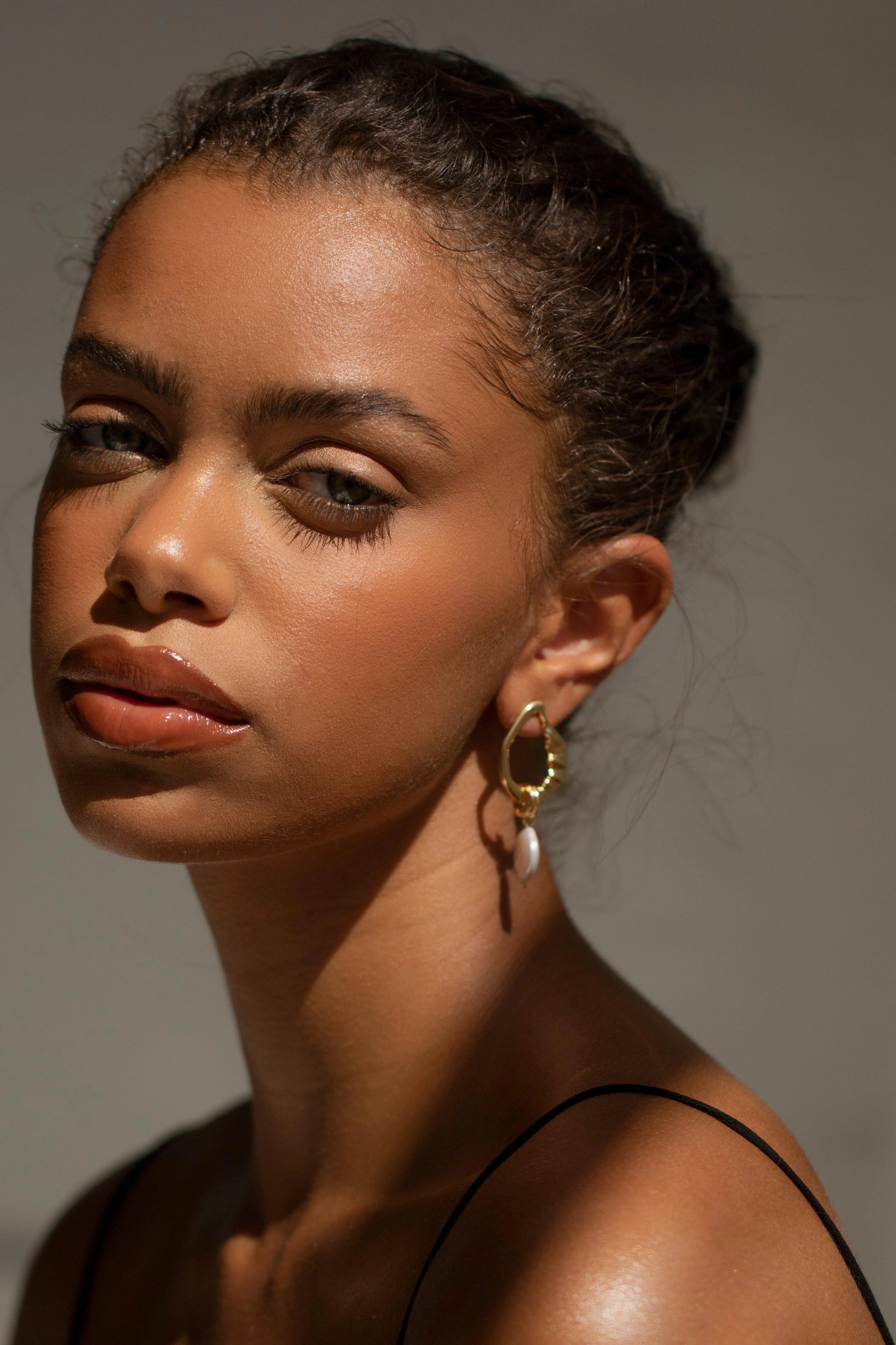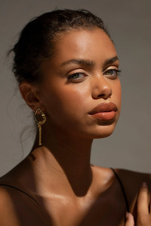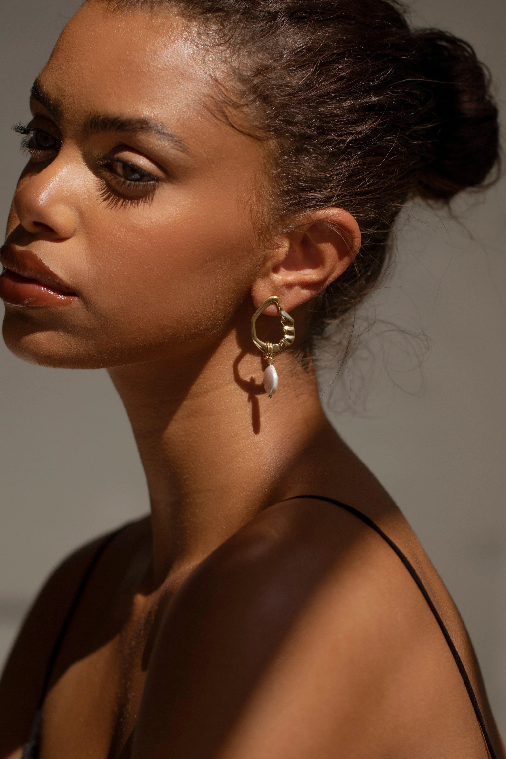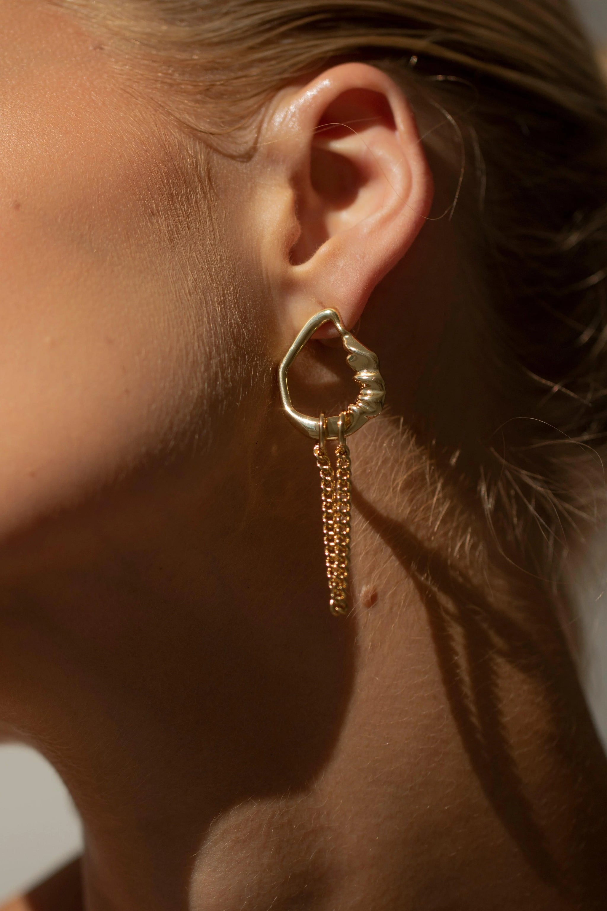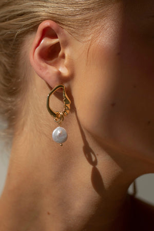 Handgerðir úr 18 karata gullhúðuðum kopar. Einn lokkurinn er með gljáandi, náttúrlegri perlu og hinn með fínni gullkeðju. Hvert stykki er einstakt.
