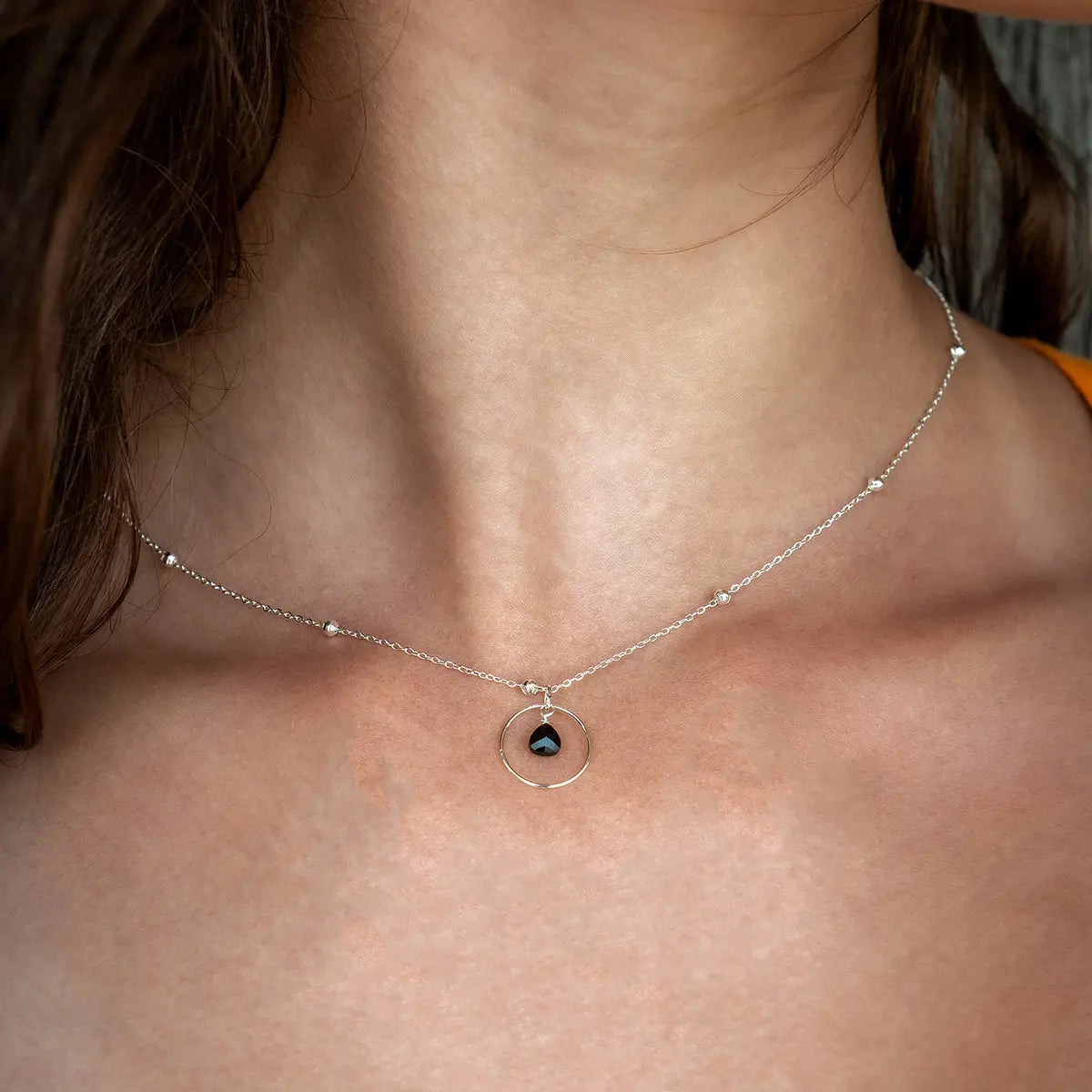 Fallegt og stílhreint hálsmen úr silfur ryðfríu stáli og glerperlu frá Vinoos.