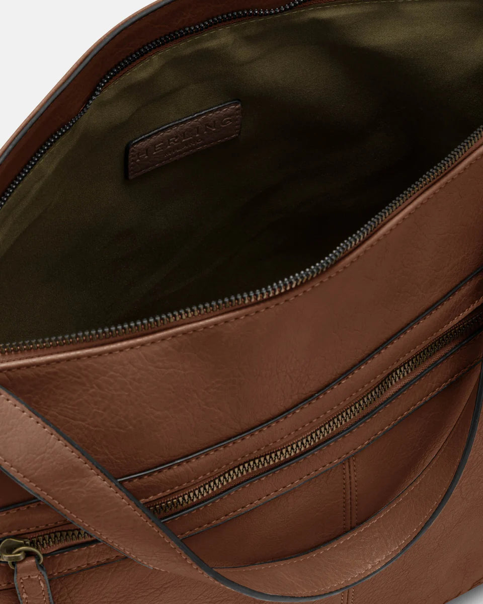 Mjög rúmgóð og falleg handtaska frá ítalska merkinu Herling. Taskan er úr hágæða vegan leðri með smá rustic yfirbragði. Rúmgott rennt hólf með nægu plássi fyrir allt sem þú þarf, fartölvuna, símann og fl. Einnig stórt rennt hólf að framan. Lengri ól fylgir einnig með töskunni.