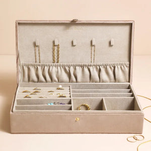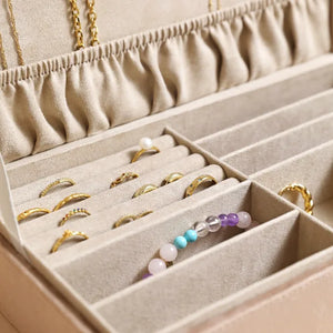 Klassískt skartgripaskrín með góðu plássi fyrir alla skartgripina þína. Pláss fyrir hringa, hálsmen, armbönd og svo miklu meira. Innvolsið er fóðrað með fallegu og mjúku efni.