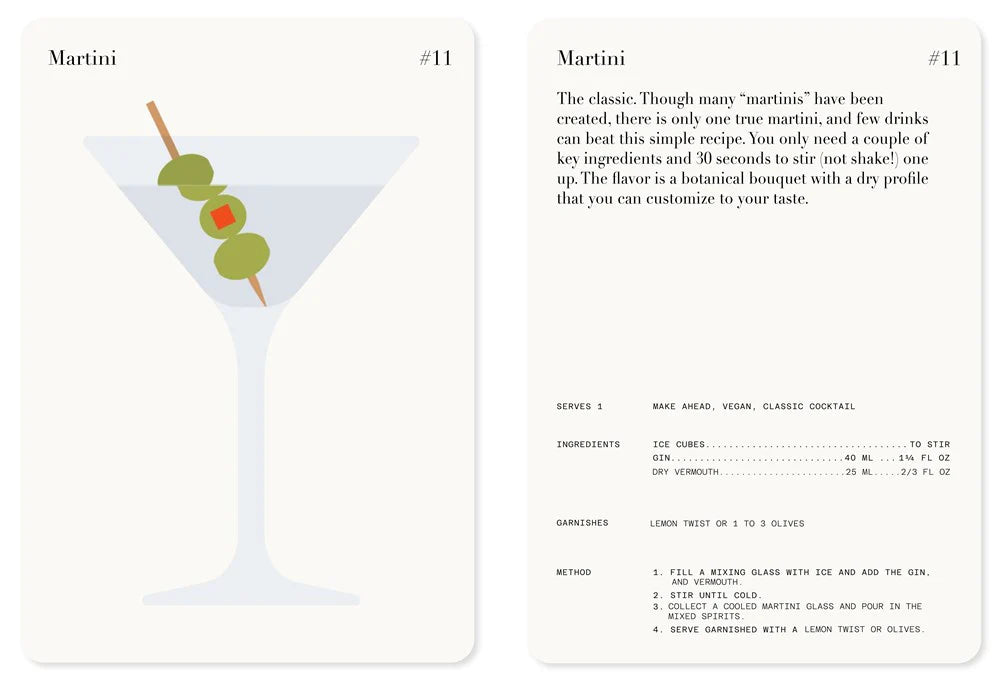 Með myndskreytingum innblásnum af miðri 20. öld og auðskiljanlegum uppskriftum er þetta spil hið fullkomna val fyrir efnilega kokteilmeistara jafnt sem reynda barþjóna.